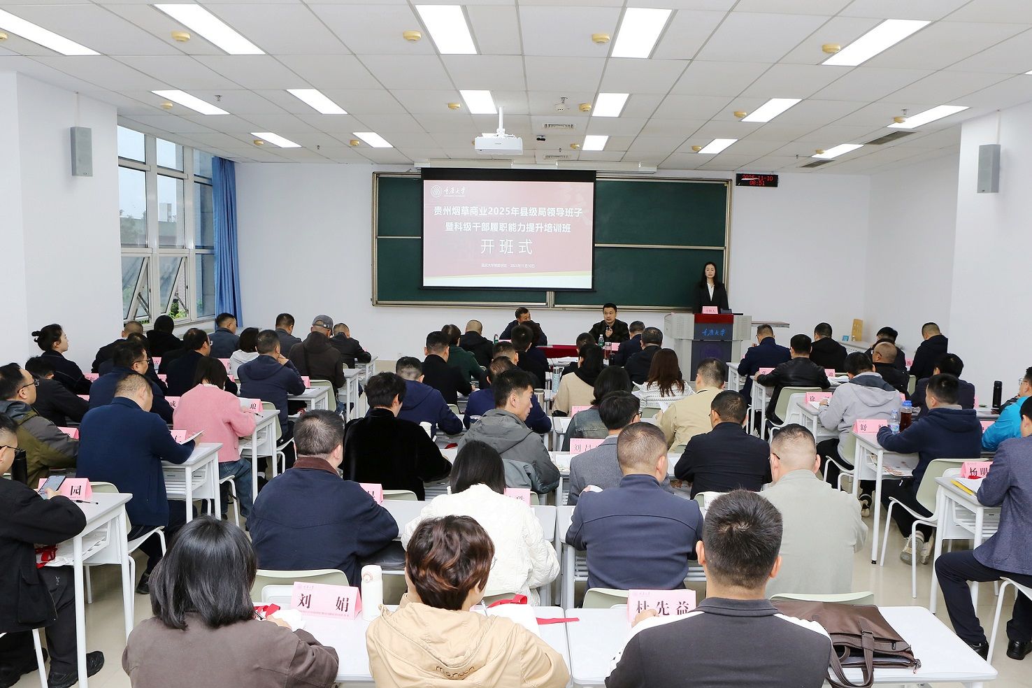 11月10日,贵州烟草商业2025年县级局领导班子暨科级干部履职能力提升培训班(第一期)在重庆大学顺利开班。重庆大学博雅学院副院长唐杰同志致欢迎辞;贵州省烟草专卖局(公司)教育培训中心三级调研员范聪贵同志作动员讲话。